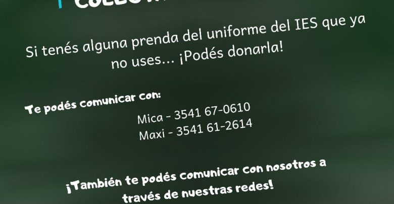 Desde la comisión directiva del Centro de Estudiantes del Instituto de Enseñanza Secundaria de Villa Carlos Paz, se esta llevando a cabo un proyecto solidario de recolección de uniformes de la institución y útiles escolares para colaborar con aquellas familias que se les dificulte el acceso a los mismos.