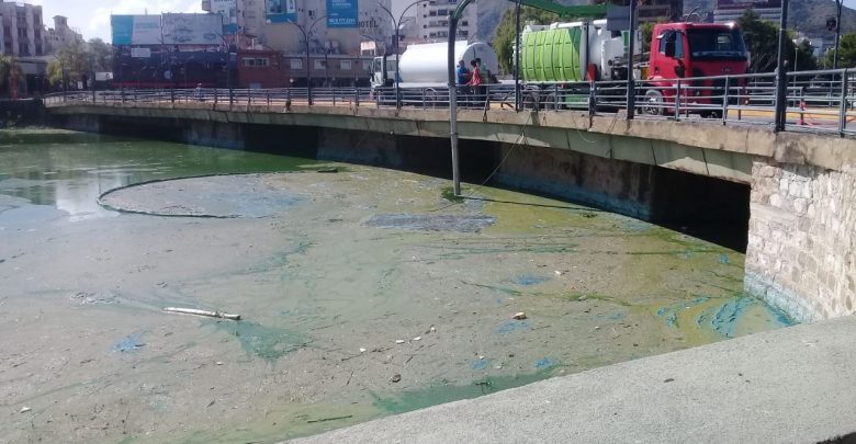 Se está trabajando intensamente en al zona del Puente Central, succionando la masa verde de cianobacterias con atmosféricos y con el camión desobstructor. De esta manera se retira la mayor parte de verde de la superficie, evitando que las algas se descompongan y emanen malos olores.