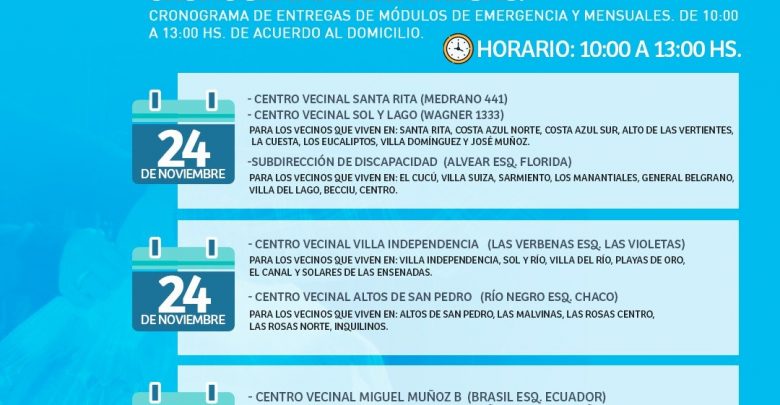 De acuerdo al cronograma establecido para la entrega de Módulos de Emergencia y Mensuales, estos son los días y lugares en los cuales se estarán entregando, siempre en el horario de 10 a 13 horas: